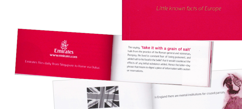 Our English Copywriter conceptualised, researched and wrote this small booklet, ‘Little Known Facts of Europe’, for Emirates Airlines. It contained fascinating and little known pieces of trivia about European cities, and was sent to frequent business travellers to promote Emirates' European destinations.<BR><BR>